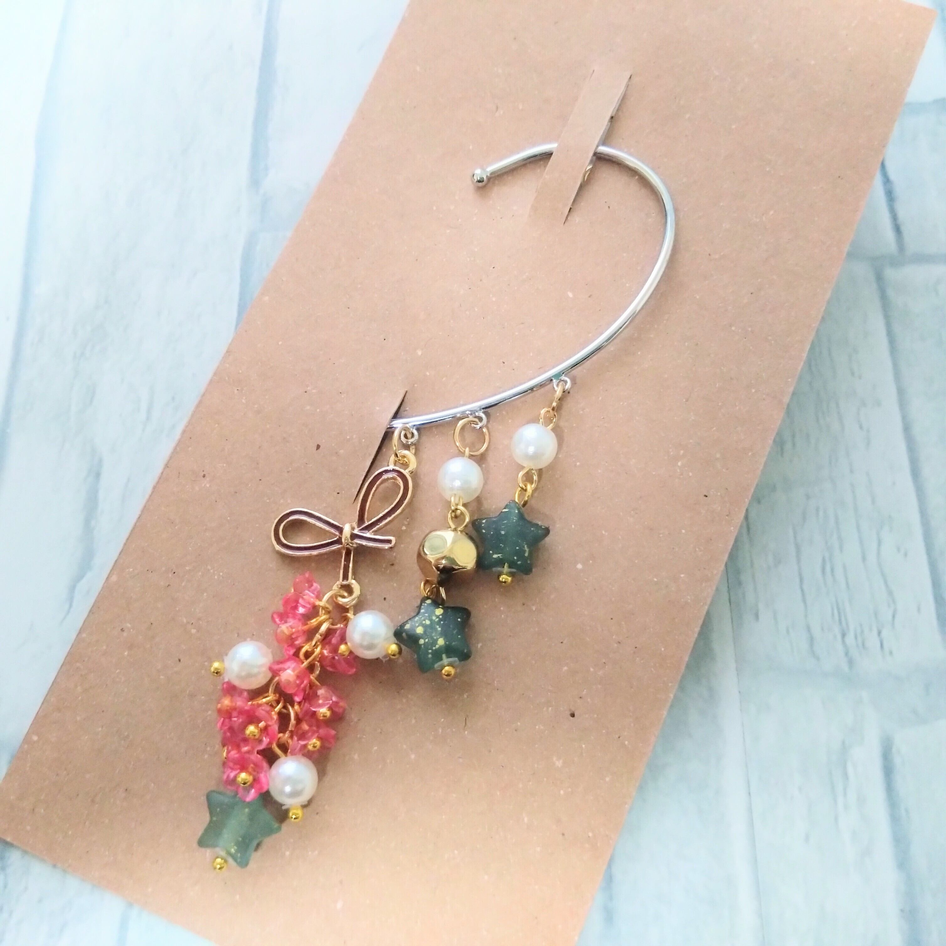 こちらは非アレルギー対応です。 耳の後ろ側に引っ掛ける、イヤーフックというアクセサリーです。 クリスマスをイメージしたお色味で作りました♪