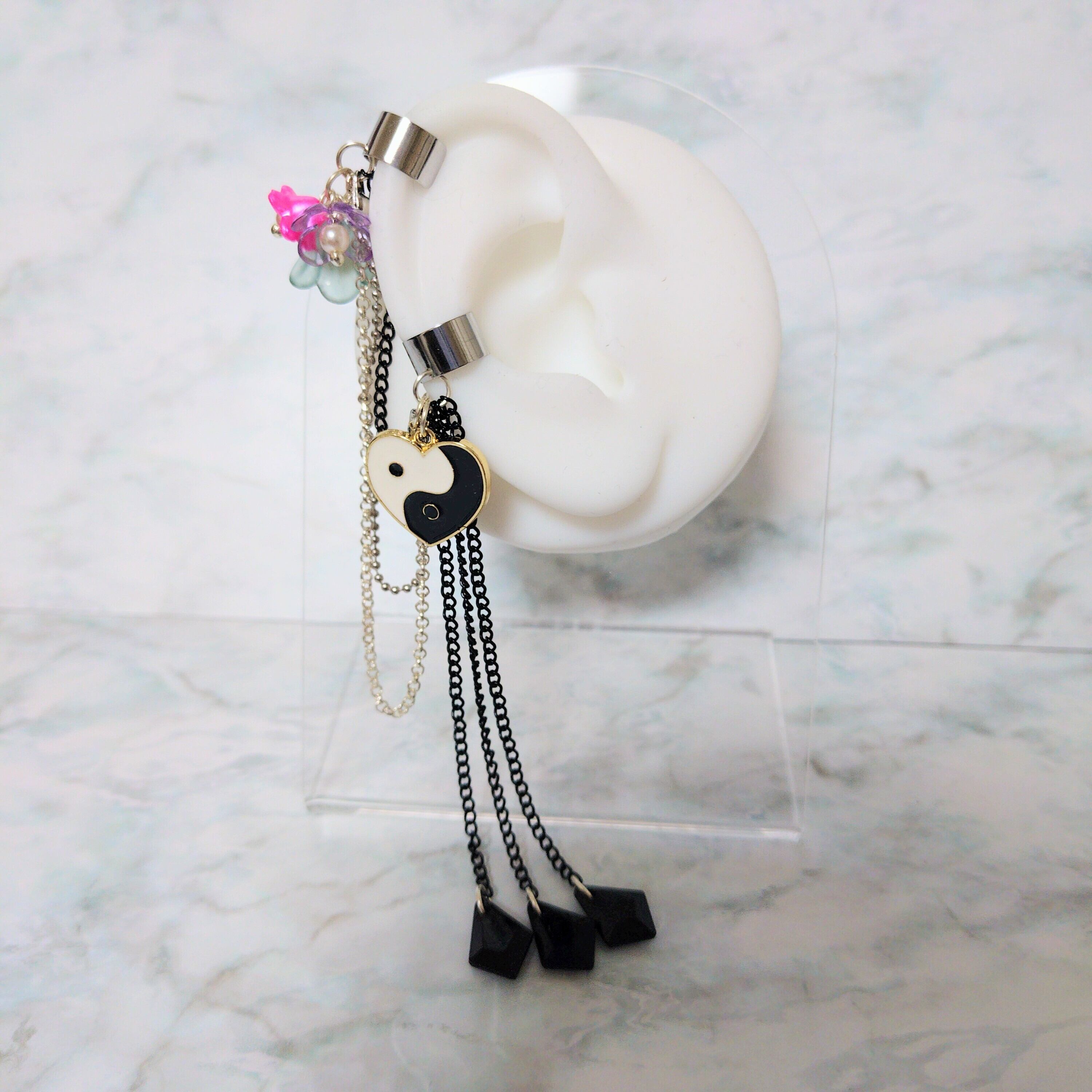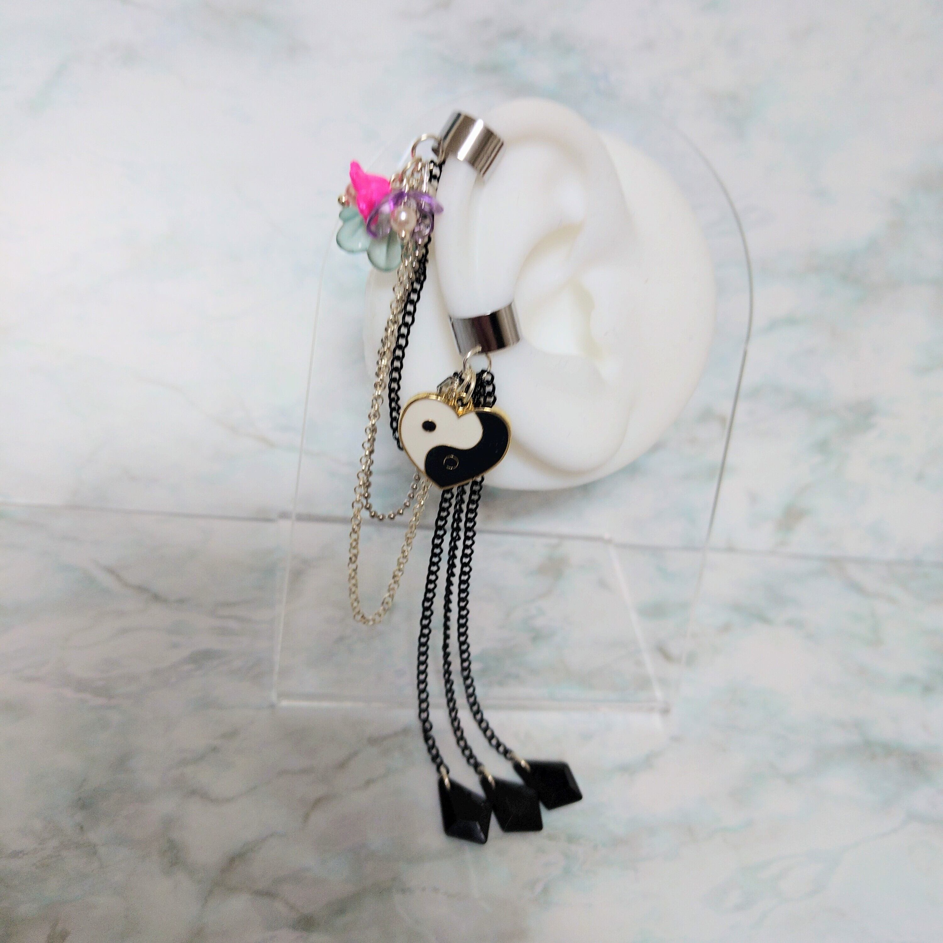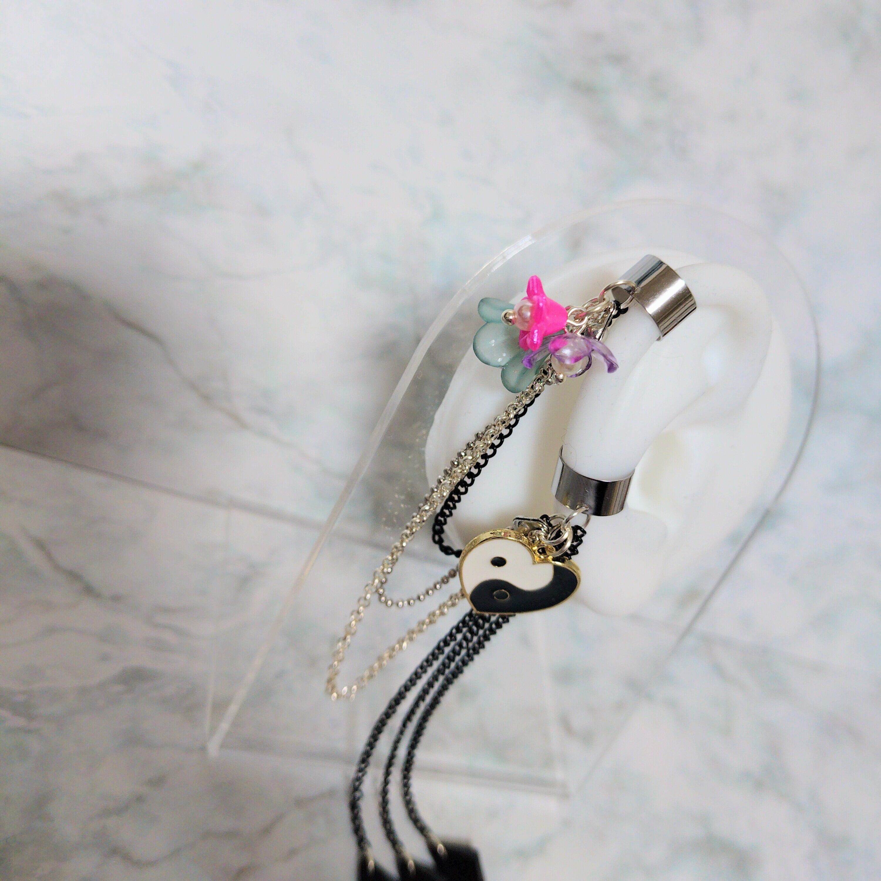 イヤーカフ部分にはステンレスを使用しております。柔らかさもあるので、お耳に合わせて調節がしやすくなっています。